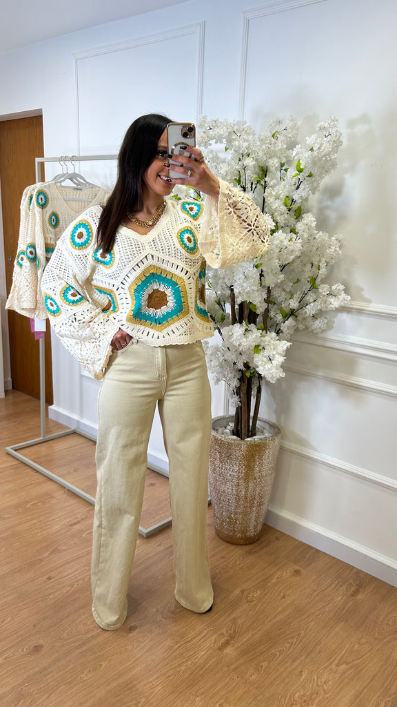 A modelo tem o tamanho S vestido.