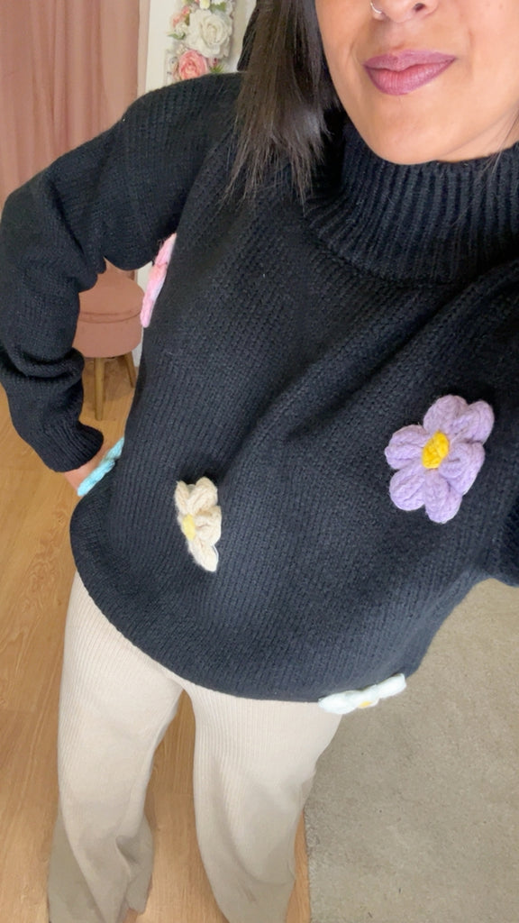 Camisola malha com flores 3D Preta