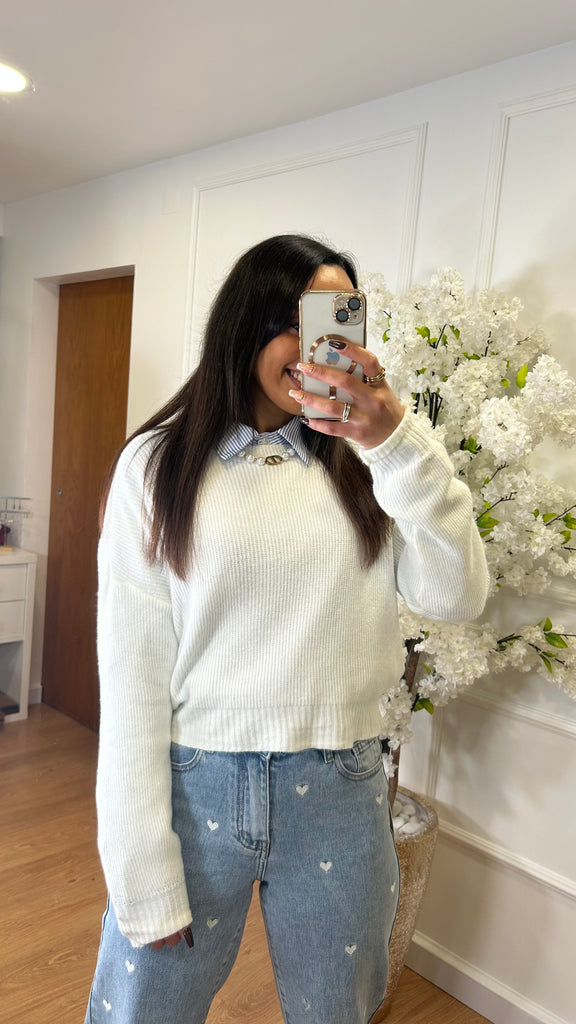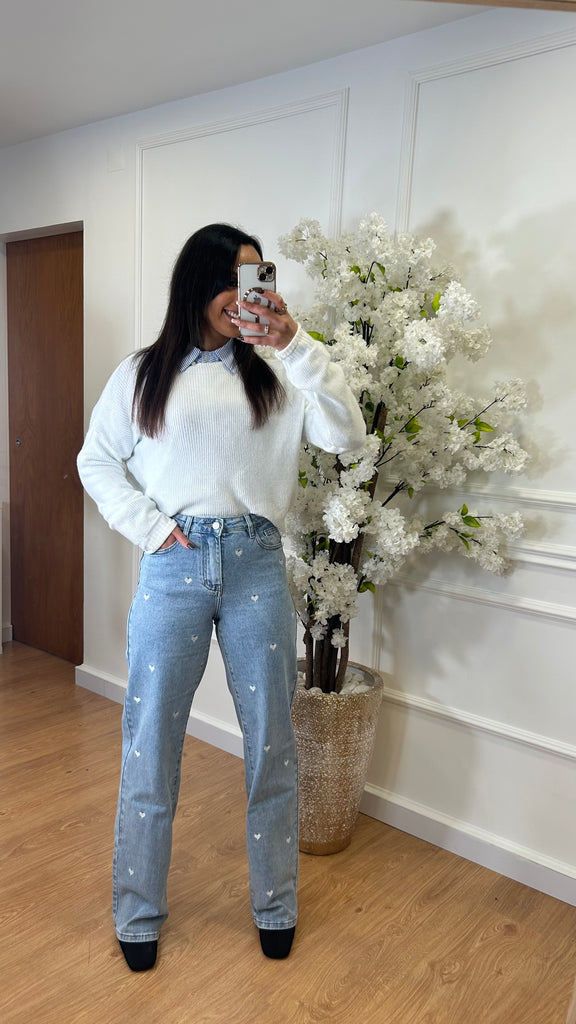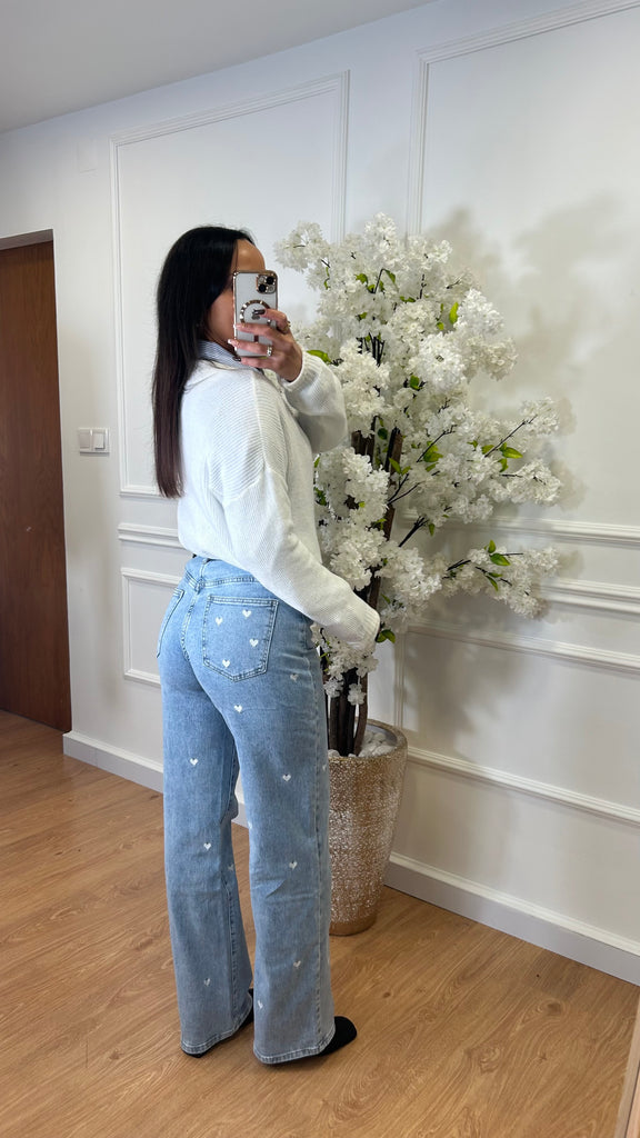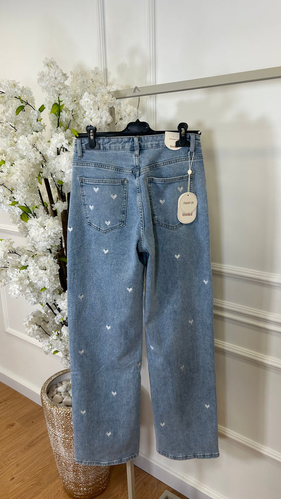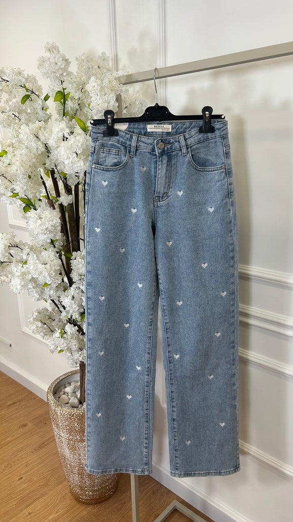 Os corações são bordados na ganga.