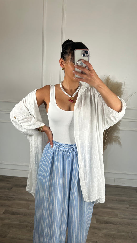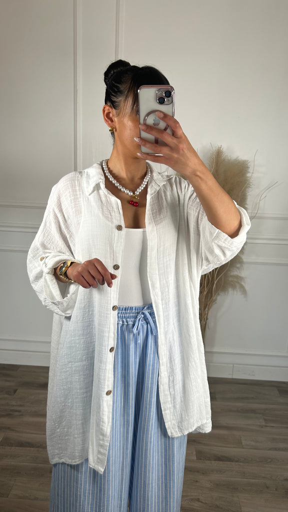 Com botões, pode ser usado como sobre camisa ou como vestido.
