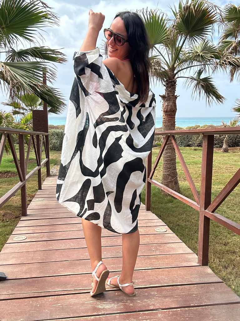 Com botões, pode ser usado como sobre camisa ou como vestido.